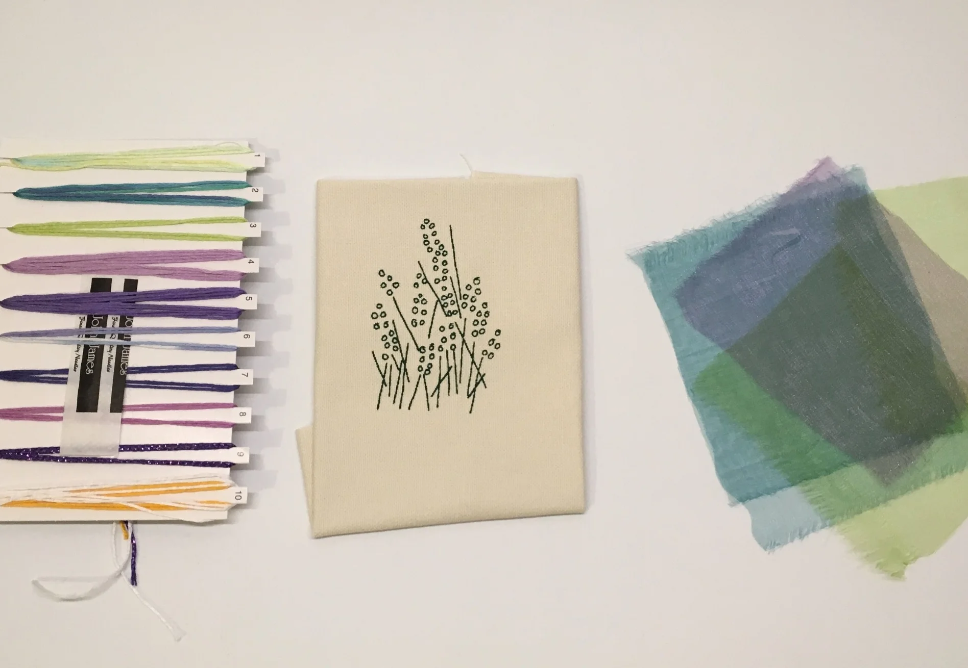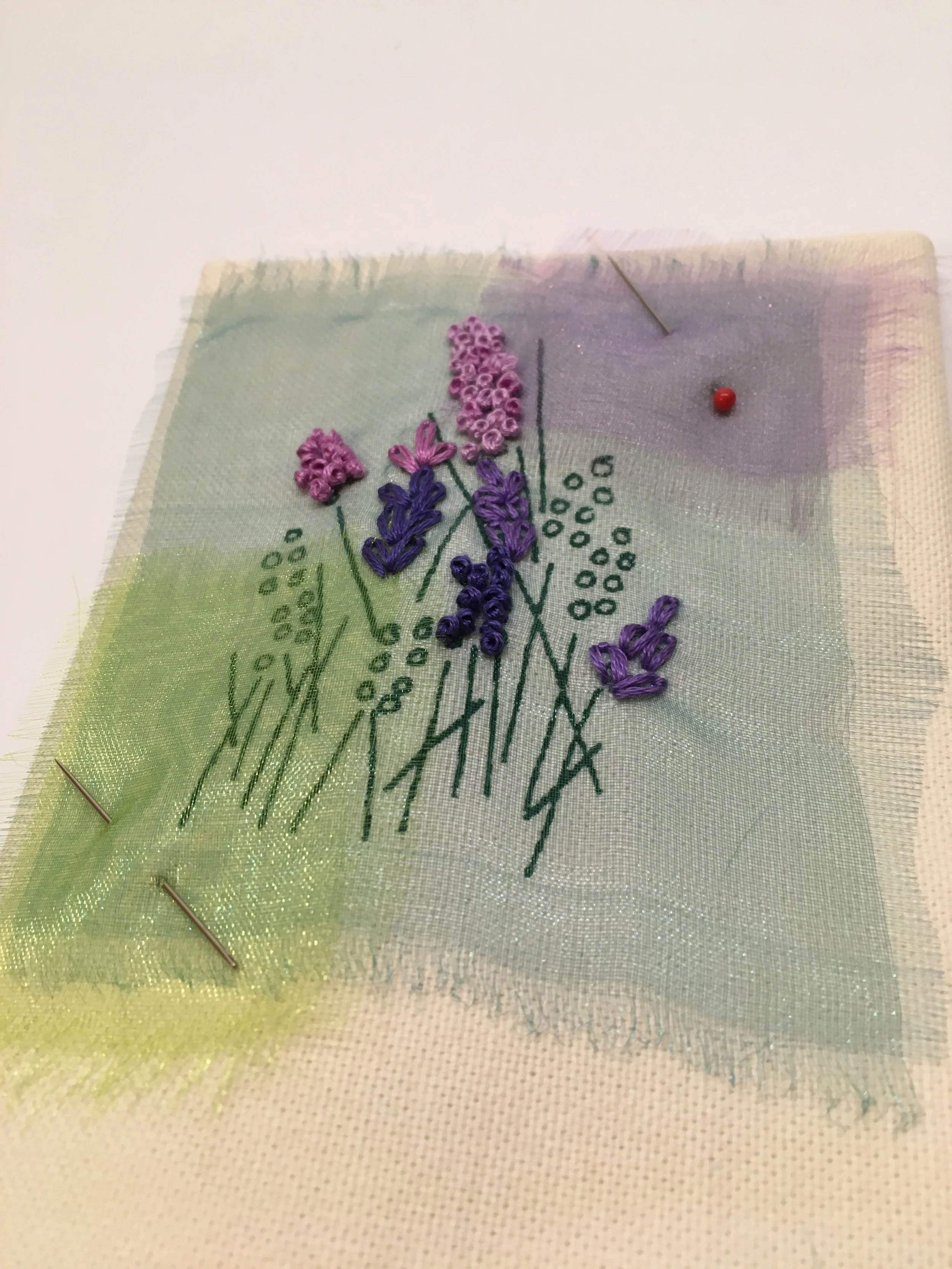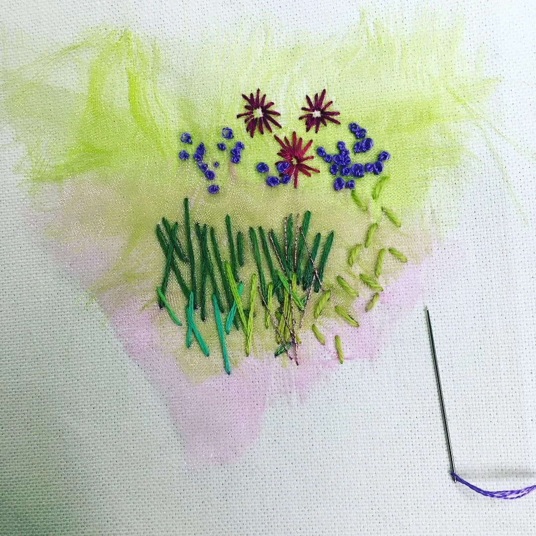 These little kits are simple, concise and have everything that you need included. The pack consists of embroidery fabric, needle, organza (to add texture to the background), embroidery threads and the design - part of which is already printed onto the fabric to help start you off.
